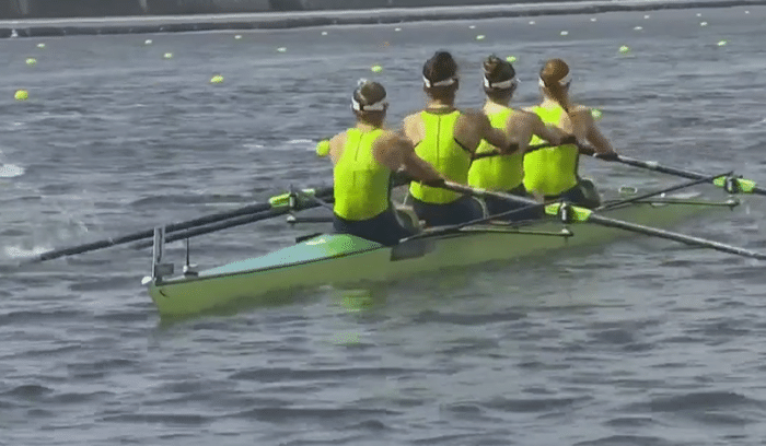 接下来进行的是赛艇女子四人双桨决赛,这个项目中国组合有实力去冲击金牌,因为天气的原因本场比赛被推迟到了今天的举行,代表中国队出战的四位选手陈云霞、张灵、吕扬和崔晓桐,预赛成绩中国以6:14.32小组第一晋级。中国组全在第三道,比赛开始后,中国组合取得了微弱的领先优势,500米的时候,中国队排在了第一的位置。