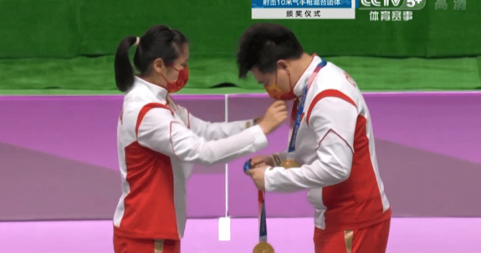 178直播讯北京时间7月27日,中国军团再添一枚金牌,在混合团体10米气手枪决赛中,姜冉鑫/庞伟在0-4落后的情况下实现大逆转,关键时刻姜冉鑫连续打出10.7环的好成绩,最终中国队16-14击败对手夺得该项目金牌;在颁奖仪式上,21岁姜冉鑫和35岁庞伟互戴金牌太暖心。