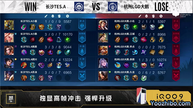 第一局双方常规开局。2分46秒杭州LGD大鹅中路击杀盾山拿下一血。3分11秒杭州LGD大鹅拿下暴君。4分37秒长沙TES.A对抗路击杀澜。6分09秒长沙TES.A摧毁敌方发育路外塔。6分24秒长沙TES.A拿下先知主宰。6分53秒杭州LGD大鹅摧毁敌方发育路外塔。7分35秒杭州LGD大鹅拿下暴君,随后团战长沙TES.A打出0换2。8分59秒长沙TES.A摧毁敌方对抗路二塔。10分23秒杭州LGD大鹅中路击杀沈梦溪。10分40秒杭州LGD大鹅拿下暗影主宰。10分58秒杭州LGD大鹅摧毁敌方中路外塔。12分20秒中路团杭州LGD大鹅打出0换2。13分01秒杭州LGD大鹅拿下暗影暴君。13分56秒杭州LGD大鹅摧毁敌方对抗路二塔。14分40秒双方中路2换2,随后杭州LGD大鹅摧毁敌方中路、发育路二塔。15分34秒杭州LGD大鹅拿下暗影主宰。16分16秒对抗路团杭州LGD大鹅打出1换3,杭州LGD大鹅鲁班七号拿下三连决胜。16分41秒杭州LGD大鹅摧毁水晶拿下比赛。