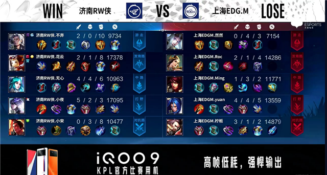 2分17秒,上海EDG.M控下暴君。3分16秒,上海EDG.M野区击杀周瑜拿下一血。4分09秒,济南RW侠控下先知主宰。4分35秒,济南RW侠破掉上海EDG.M下一塔。5分10秒,上海EDG.M破掉济南RW侠上一塔。6分24秒,上海EDG.M破掉济南RW侠下一塔,随后控下暴君。7分42秒,济南RW侠中路击杀夏侯惇。8分35秒,野区团,上海EDG.M打出0换2,随后破掉济南RW侠中一塔。9分31秒,上海EDG.M控下主宰。10分钟,野区团,上海EDG.M打出1换2。11分08秒,济南RW侠控下暗影暴君,随后上海EDG.M镜像控下暗影主宰。12分42秒,济南RW侠澜上路单杀娜可露露。13分18秒,济南RW侠先后破掉上海EDG.M中上二塔。14分40秒,野区团,上海EDG.M打出3换4。16分07秒,上海EDG.M控下暗影主宰,随后济南RW侠镜像拿下暗影暴君。17分24秒,济南RW侠野区击杀马可波罗。17分54秒,济南RW侠先后破掉上海EDG.M中下高地塔,随后团战打出3换4。18分54秒,济南RW侠高地击杀沈梦溪随后摧毁水晶获得大场胜利。