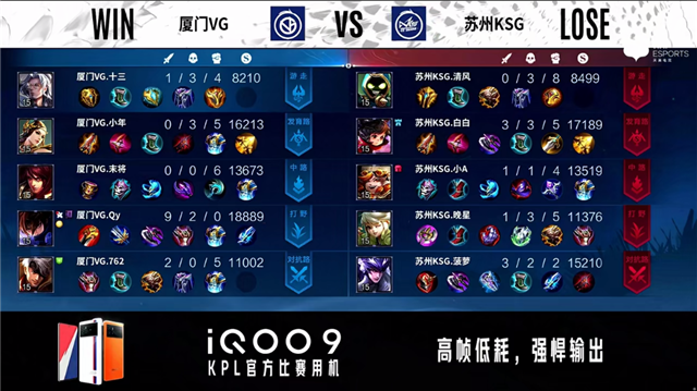 2分10秒,苏州KSG伽罗击杀东皇太一拿下一血。2分27秒,苏州KSG控下暴君。3分39秒,厦门VG橘右京击杀吕布,随后关羽再击杀娜可露露。4分45秒,双方团,苏州KSG打出0换2。5分10秒,苏州KSG吕布下路击杀关羽。6分50秒,苏州KSG控下暴君,随后破掉厦门VG下一塔。8分47秒,中路团,苏州KSG击杀弈星,随后控下先知主宰。9分17秒,苏州KSG破掉厦门VG上一塔。10分20秒,厦门VG橘右京抢到暗影暴君。11分48秒,厦门VG击杀娜可露露,随后破掉苏州KSG上二塔。12分06秒,厦门VG控下暗影主宰。12分15秒,厦门VG破掉苏州KSG中一塔。13分16秒,双方团,厦门VG打出1换2。13分57秒,厦门VG破掉苏州KSG中二塔。15分43秒,双方团战1换1,厦门VG破掉苏州KSG下二塔。16分17秒,厦门VG控下暗影暴君。17分20秒,厦门VG破掉苏州KSG上高地。17分58秒,厦门VG击杀吕布。18分30秒,厦门VG破掉苏州KSG下高地。18分45秒,厦门VG控下暗影暴君。19分45秒,双方团战4换4。21分47秒,双方团,苏州KSG打出1换2。23分20秒,双方团,厦门VG打出2换5团灭对手。23分50秒,厦门VG中路一波摧毁苏州KSG水晶赢下比赛。