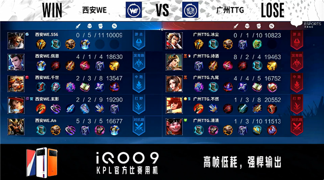 开局广州TTG入侵野区反掉蓝BUFF。2分43秒野区击杀张飞拿到一血。4分16秒主宰处团战双方1换1。7分25秒广州TTG拿下暴君。8分27秒西安WE对抗路击杀裴擒虎。6分47秒西安WE拿下主宰。9分31秒西安WE摧毁敌方中路外塔。9分47秒广州TTG中路击杀牛魔。10分17秒广州TTG拿下暗影暴君。10分53秒广州TTG拿下暗影主宰。11分56秒广州TTG中路击杀关羽。12分52秒广州TTG摧毁敌方发育路二塔。14分24秒西安WE中路击杀不知火舞。15分01秒西安WE摧毁敌方中路二塔。17分40秒西安WE中路击杀虞姬。18分07秒广州TTG摧毁敌方发育路二塔。20分29秒广州TTG抢到风暴龙王并打出2换5。22分18秒广州TTG摧毁敌方对抗路高地塔。22分36秒中路团战西安WE击杀猪八戒。23分53秒广州TTG拿下风暴龙王,团战广州TTG打出1换2。24分26秒西安WE摧毁敌方发育路高地塔。25分36秒高地团战广州TTG击杀牛魔并摧毁中路高地塔。27分23秒西安WE拿下风暴龙王并打出0换2。28分36秒西安WE摧毁敌方水晶拿下比赛。