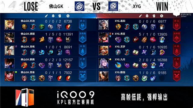 双方常规开局。2分33秒中路团战XYG打出0换2。4分45秒XYG拿下暴君。5分44秒发育路团战佛山GK打出1换3,娜可露露拿到三连决胜。7分29秒佛山GK摧毁敌方对抗路外塔。8分52秒佛山GK拿下主宰。9分14秒中路团战佛山GK打出0换2。11分04秒主宰处团战XYG打出0换2并摧毁敌方中路外塔。13分19秒XYG拿下暗影主宰。14分10秒XYG摧毁敌方对抗路二塔。16分07秒XYG摧毁敌方中路二塔。18分01秒XYG拿下暗影主宰。19分32秒XYG摧毁敌方发育路高地塔。19分45秒发育路团战双方2换2。21分42秒中路团战佛山GK打出2换3,不知火舞拿到三连决胜。22分30秒XYG镜对抗路单杀不知火舞。23分03秒XYG拿下风暴龙王。24分15秒XYG野区击杀不知火舞。24分40秒高地团战XYG打出0换2。24分50秒XYG摧毁敌方水晶拿下比赛。