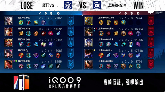 2分15秒,上海RNG.M控下暴君。3分19秒,厦门VG澜击杀橘右京拿下一血。3分44秒,厦门VG控下先知主宰。4分40秒,厦门VG破掉上海RNG.M下一塔。5分04秒,厦门VG上路击杀橘右京。5分43秒,厦门VG破掉上海RNG.M上一塔。6分18秒,厦门VG上路击杀橘右京并破掉上海RNG.M上二塔。6分45秒,厦门VG李元芳击杀马超,随后控下暴君。8分35秒,厦门VG控下先知主宰,随后破掉上海RNG.M中一塔。9分20秒,双方团战1换1。9分50秒,双方团战2换2,厦门VG主宰先锋破掉上海RNG.M下二塔。10分41秒,厦门VG控下暗影主宰。11分45秒,厦门VG破掉上海RNG.M下高地。12分38秒,厦门VG控下暗影暴君。13分26秒,厦门VG破掉上海RNG.M中二塔。14分25秒,厦门VG控下暗影主宰,随后破掉上海RNG.M上二塔。14分50秒,厦门VG破掉上海RNG.M中高地。15分13秒,厦门VG边团边拆摧毁上海RNG.M水晶赢下比赛。