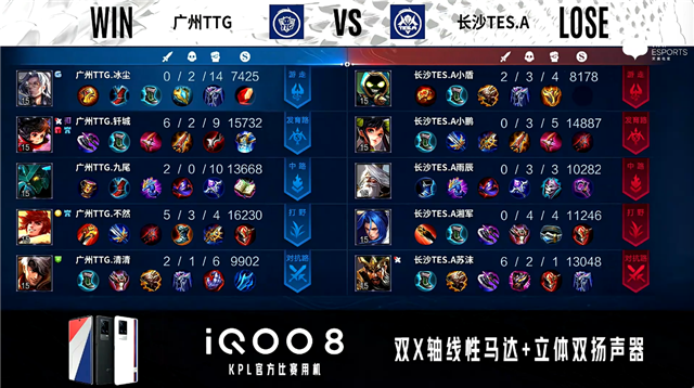 双方常规开局。1分51秒广州TTG对抗路击杀马超拿到一血。2分45秒广州TTG中路击杀嬴政。3分37秒广州TTG对抗路打出0换2。6分57秒双方野区1换1。7分18秒广州TTG野区击杀阿古朵。7分29秒广州TTG摧毁敌方中路外塔。8分15秒广州TTG拿下暗影主宰。8分48秒广州TTG对抗路击杀张飞。9分08秒广州TTG摧毁敌方对抗路二塔。9分57秒广州TTG拿下暗影暴君。10分51秒广州TTG摧毁敌方发育路二塔并击杀张飞。11分03秒广州TTG摧毁敌方中路二塔。16分19秒中路团战双方1换1。16分50秒长沙TES.A对抗路击杀娜可露露。17分46秒广州TTG主宰处打出0换2。18分27秒广州TTG摧毁敌方水晶拿下比赛。