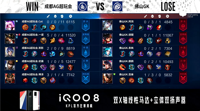 开局成都AG不知火舞走对抗路、廉颇走中路,佛山GK嬴政走发育路、公孙离走中路。2分13秒佛山GK抢到主宰。8分14秒佛山GK摧毁敌方中路外塔。10分14秒佛山GK拿下暗影暴君。11分53秒佛山GK拿下暗影主宰。13分06秒佛山GK中路击杀不知火舞拿到一血。13分17秒佛山GK摧毁敌方中路二塔。13分38秒佛山GK野区击杀大乔。14分07秒佛山GK摧毁敌方对抗路高地塔,团战双方打野互换。15分11秒成都AG拿下暗影暴君。16分14秒佛山GK拿下暗影主宰。18分06秒发育路团战成都AG打出0换2,佛山GK摧毁敌方发育路高地塔。18分53秒双方中路1换1。20分49秒佛山GK野区击杀不知火舞。21分24秒野区团战佛山GK打出0换4。21分43秒佛山GK团灭对手摧毁水晶拿下比赛。