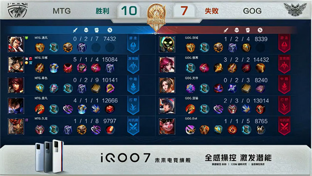 开局GOG伽罗中路抢线。1分05秒GOG拿下中路河道之灵。2分05秒GOG拿下主宰。15秒MTG拿下暴君。4分28秒GOG发育路团战打出0换3。5分44秒GOG中路下河道击杀周瑜。6分42秒野区团战MTG打出0换3。7分06秒MTG摧毁敌方中路外塔。7分21秒MTG摧毁敌方中路二塔。7分55秒MTG摧毁敌方对抗路二塔。9分09秒MTG发育路团战击杀太乙真人。10分09秒MTG拿下暗影主宰。10分24秒MTG摧毁敌方发育路二塔。10分38秒MTG拿下暗影暴君。11分09秒MTG对抗路击杀娜可露露。13分39秒MTG对抗路击杀不知火舞。14分08秒MTG摧毁敌方对抗路高地塔。14分38秒高地团战MTG打出1换2。15分29秒MTG拿下暗影暴君。16分03秒MTG拿下暗影主宰。17分14秒高地团战MTG击杀娜可露露并摧毁敌方发育路高地塔。17分49秒MTG强点水晶拿下比赛。