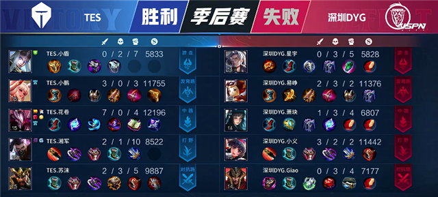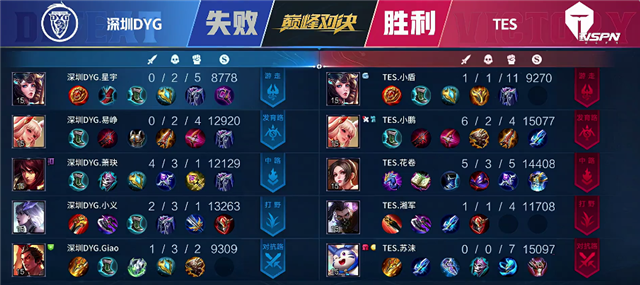 51秒杨玉环在上河道拿下一血。2分30秒澜拿下暴君。5分13秒蒙犽单杀马可波罗。6分20秒蒙犽推掉下路一塔。6分50秒野区团战,双方2换2,蒙犽和马超分别拿下双杀,盘古拿下主宰。8分钟中路团战,深圳DYG打出1换2。8分50秒深圳DYG推掉中路一塔。9分钟太乙真人被击杀。10分15秒TES上路二塔被破。10分30秒澜拿下暴君。10分53秒蒙犽推掉下路二塔。12分钟澜拿下主宰。12分40秒上路团战,TES打出1换3,马超拿下双杀。14分钟TES中路二塔被破。15分30秒暴君团,TES打出0换3。15分50秒TES推掉中路一塔,盘古拿下暴君。17分32秒盘古拿下主宰。18分15秒太乙真人被击杀。18分25秒野区团战,TES团灭深圳DYG,马可波罗拿下双杀。19分21秒TES推掉下路和中路高地塔。20分30秒野区团战,猪八戒被击杀。23分17秒马超一人偷掉水晶扳回一分。