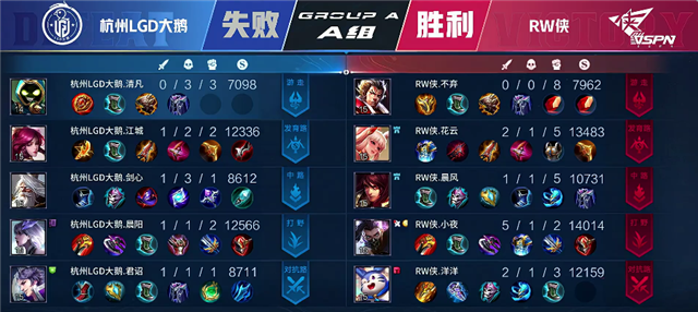 1分50秒杭州LGD大鹅强攻上路一塔,盘古拿下一血。2分10秒盘古拿下主宰。3分15秒中路交火,盘古被击杀。3分51秒澜拿下暴君。4分40秒成吉思汗推掉下路一塔。5分10秒野区团战,双方1换1。6分45秒RW侠强攻中路一塔,廉颇被击杀。7分钟成吉思汗推掉下路二塔,RW侠推掉中路二塔。8分20秒澜拿下暴君。8分40秒马可波罗推掉下路一塔。10分40秒澜拿下暴君。12分40秒中路团战,廉颇被击杀。13分40秒澜拿下主宰。15分20秒高地团战,RW侠团灭杭州LGD大鹅。15分40秒RW侠推掉水晶拿下本场比赛胜利。
