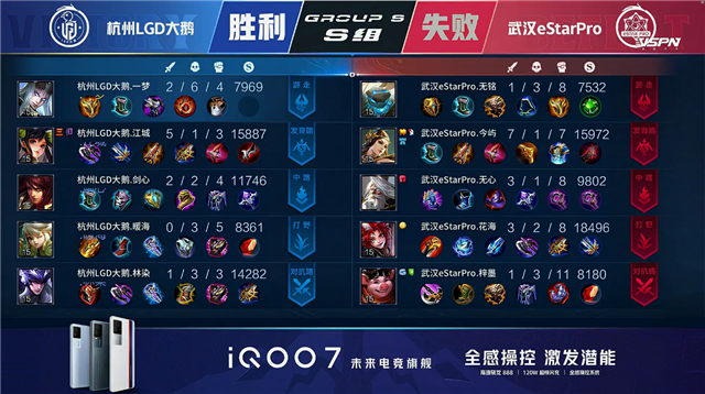 开局武汉ES入侵野区拿到蓝BUFF。55秒武汉ES主宰处击杀马超拿到一血。1分10秒中路团战武汉ES打出0换2。3分20秒武汉ES拿下暴君。4分50秒双方中路1换1。5分34秒杭州LGD大鹅摧毁敌方中路外塔。5分58秒武汉ES拿下主宰。7分26秒武汉ES拿下暴君。8分40秒武汉ES主宰处击杀阿古朵。10分43秒武汉ES拿下暗影暴君,团战双方1换1。11分14秒杭州LGD大鹅拿下暗影主宰,武汉ES打出0换3。13分44秒中路团战双方2换2。15分整杭州LGD大鹅中路击杀盾山。17分21秒武汉ES摧毁敌方下路二塔。17分36秒武汉ES摧毁敌方中路外塔。18分44秒杭州LGD大鹅中路打出3换5。19分25秒杭州LGD大鹅摧毁敌方水晶拿下比赛。