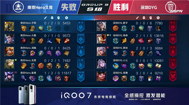 双方平稳开局。1分05秒南京Hero中路击杀盘古拿到一血。2分19秒南京Hero拿下暴君。2分24秒南京Hero下路击杀太乙真人。4分20秒深圳DYG抢到主宰。4分44秒深圳DYG上路击杀橘右京。6分22秒双方互换边路外塔。6分30秒南京Hero拿下暴君。6分47秒南京Hero中路击杀马超。7分35秒上路团战南京Hero打出1换2。7分53秒南京Hero摧毁敌方上路外塔。8分35秒南京Hero拿下主宰。8分54秒南京Hero摧毁敌方中路外塔。10分21秒南京Hero拿下暗影主宰。11分26秒南京Hero橘右京中路以一敌二反杀马超。11分45秒深圳DYG中路击杀蔡文姬,南京Hero摧毁敌方中路二塔。13分21秒南京Hero摧毁敌方下路二塔。14分21秒深圳DYG下路击杀蔡文姬。14分50秒深圳DYG拿下暗影主宰。17分02秒深圳DYG拿下暗影暴君。17分39秒中路团战深圳DYG打出0换3,伽罗拿到二连击破。18分16秒深圳DYG摧毁敌方上路高地塔。19分24秒南京Hero拿下暗影主宰并击杀盘古。19分40秒野区团战南京Hero打出1换4。20分15秒南京Hero摧毁敌方中路高地塔。20分28秒南京Hero摧毁敌方水晶拿下比赛。