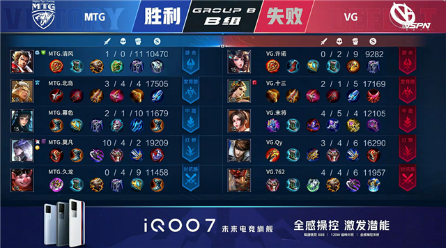 开局56秒VG上路击杀沈梦溪拿到一血。1分11秒VG拿下中路河道之灵。2分35秒VG抢到暴君。3分14秒VG中路击杀沈梦溪。4分31秒VG拿下主宰。5分50秒VG摧毁敌方上路外塔。7分15秒VG中路击杀夏洛特。11分04秒VG拿下暗影主宰。11分26秒MTG拿下暗影暴君,VG击杀太乙真人。12分14秒VG上路击杀夏洛特。12分33秒MTG摧毁敌方下路二塔。12分40秒VG上路打出0换2。13分04秒VG摧毁敌方下路高地塔。14分36秒VG中路打出2换4,百里守约拿到二连击破。15分03秒VG摧毁敌方中路高地塔。16分13秒VG拿下暗影暴君。16分38秒野区团战VG打出0换5。16分52秒VG摧毁敌方水晶拿下比赛。