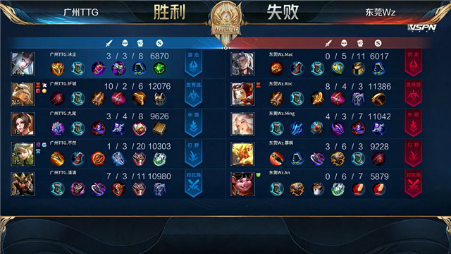开局广州TTG射手中路抢线。1分10秒广州TTG拿下中路河道之灵,团战广州TTG打出0换2。2分17秒东莞Wz拿下暴君。3分12秒广州TTG中路击杀盘古。3分37秒东莞Wz野区击杀东皇太一。3分59秒东莞Wz下路击杀不知火舞,广州TTG上路击杀盘古。4分40秒中路团战双方2换2。4分55秒广州TTG主宰处击杀鲁班七号。6分10秒广州TTG中路击杀猪八戒。6分50秒广州TTG摧毁敌方下路外塔。7分03秒广州TTG拿下暴君。7分57秒上路团战东莞Wz打出2换5,鲁班七号打出三连决胜。9分38秒广州TTG拿下主宰。10分24秒野区团战广州TTG打出0换3。10分35秒广州TTG拿下暗影暴君。11分24秒广州TTG摧毁敌方上路二塔。11分34秒野区团战双方1换1。12分58秒野区团战广州TTG打出0换2。13分16秒东莞Wz中路击杀不知火舞。13分28秒上路双方2换2。14分13秒双方游走野区互换。14分55秒上路团战广州TTG打出0换4,后羿拿到三连决胜。15分23秒广州TTG摧毁敌方中路高地塔。15分30秒广州TTG摧毁敌方水晶拿下比赛。
