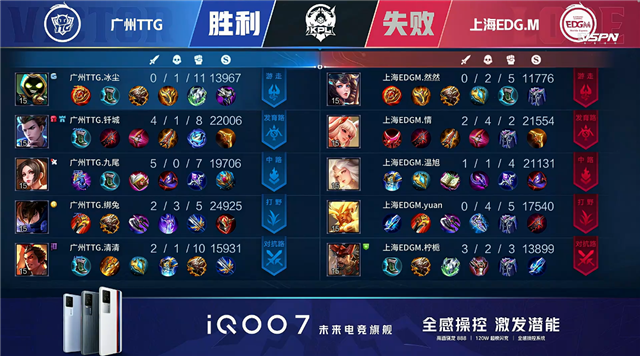 双方平稳开局,2分16秒中路团战上海EDG.M击杀澜拿到一血。2分41秒上海EDG.M拿下主宰。4分06秒上海EDG.M摧毁敌方下路外塔。4分22秒上海EDG.M拿下暴君。5分33秒双方中路1换1。6分58秒上海EDG.M拿下主宰。7分46秒中路团战广州TTG击杀盘古。7分59秒广州TTG上路击杀大乔。9分38秒广州TTG摧毁敌方下路外塔。10分43秒广州TTG抢到暗影暴君。11分38秒广州TTG摧毁敌方上路二塔。11分53秒广州TTG摧毁敌方中路二塔。12分02秒上海EDG.M上路击杀吕布。12分51秒上海EDG.M拿下暗影主宰。13分31秒上海EDG.M摧毁敌方上路二塔。15分31秒广州TTG拿下黑暗暴君,野区团战广州TTG打出1换3。17分14秒广州TTG拿下主宰。21分41秒野区团战广州TTG打出0换2。22分24秒高地团战广州TTG摧毁敌方三路高地塔,上海EDG.M击杀澜。23分16秒上海EDG.M拿下风暴龙王。24分49秒上海EDG.M摧毁敌方上路高地塔。26分36秒中路团战双方1换1。29分19秒下路团战广州TTG打出0换4。29分51秒广州TTG摧毁水晶拿下比赛。