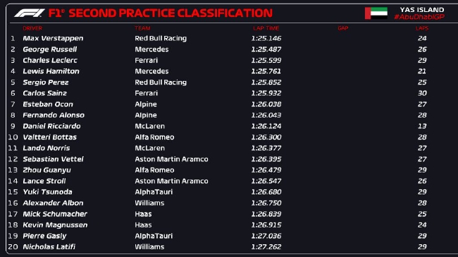 2022年F1阿布扎比大奖赛第2次练习赛成绩表: