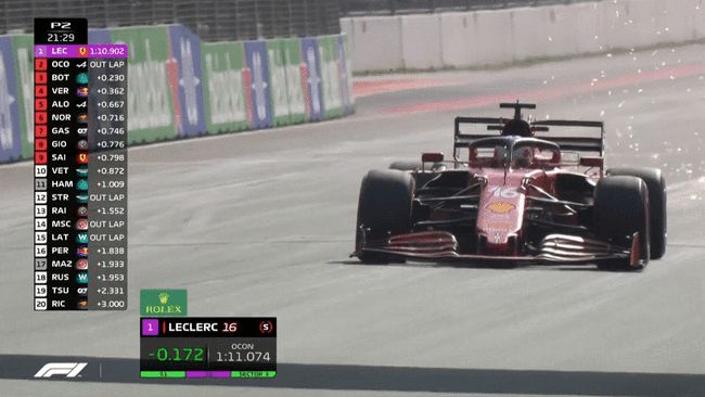 最终二练结束,两位法拉利车手包揽一二,勒克莱尔凭借1:10.902的成绩排在第一,他也是周五练习赛中唯一跑进1分11秒的车手。塞恩斯落后0.154秒排在第二,奥康第三,落后0.172秒。博塔斯第四,维斯塔潘第五。第六至第十名分别是阿隆索、加斯利、诺里斯、吉奥维纳兹和维特尔。汉密尔顿因赛车故障未能作出软胎成绩。