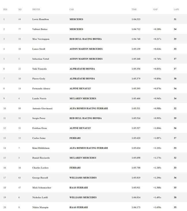2021F1奥地利大奖赛二练成绩: