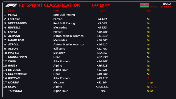 178直播讯 2023年F1阿塞拜疆大奖赛冲刺赛,红牛车队的塞尔吉奥·佩雷兹取得冲刺赛胜利,收获8个积分!法拉利车队的勒克莱尔第二,维斯塔潘驾驶受损的赛车取得第三,排名第四至八位的车手分别是,拉塞尔、塞恩斯、阿隆索、汉密尔顿、斯托尔。冲刺赛前八名的车手将分别获得8-7-6-5-4-3-2-1分!