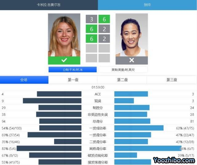 决胜盘张帅在第4局和第6局两次遭到破发,吉奥尔吉5-1来到发球胜赛局。第8局张帅挽救3个赛点并在第4个破发点兑现,局分追到2-5。第8局吉奥尔吉再度破发,6-2赢下决胜盘比赛。
