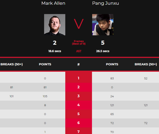 比赛一开始,庞俊旭打出单杆52分,以总分83-0率先拿下,第二局艾伦上手便是单杆81分扳平,第三局,艾伦再次展开了强有力的进攻,单杆101再下一局,第四局,小将庞俊旭并没有被艾伦的猛烈进攻所影响,抓住艾伦一杆失误,上手打出单杆121分,还以颜色,中场休息,双方以2-2握手言和。