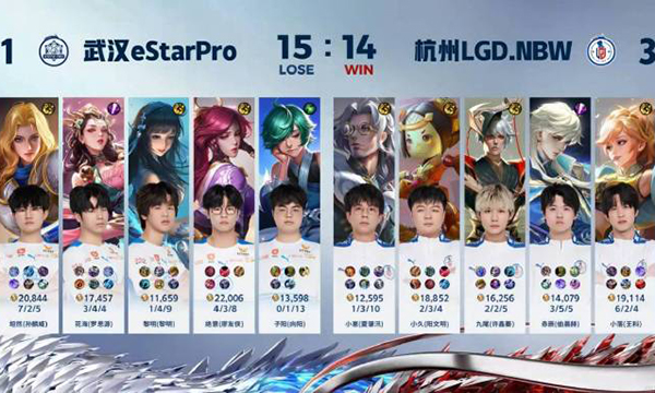 十三分半杭州LGD.NBEW带着龙兵上到高地,打出二换四,但 武汉eStar绝意 (廖友侠)公孙离二技能关键格挡拿到二连击破,缓解兵线危机。武汉ES重整旗鼓反扑出来,不断打出对方掉点将经济追平。十八分半绝意(廖友侠)公孙离出其不意从后方将孙尚香点掉,武汉ES一换四,将兵线带上高地扳回一局。