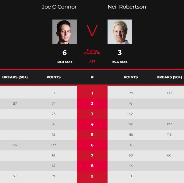 第八局,奥康纳薄最左侧红球出现了失误,并给罗伯逊留下右侧底袋红球的进攻机会,罗伯逊进攻失误。奥康纳再次出现防守失误,罗伯逊尝试进攻再次出现失误并给奥康纳留下好机会。奥康纳打进红球成功获得上手机会,在拿到16分之后出现失误。随后罗伯逊拼进右侧底袋远台红球成功获得上手机会,在拿到24分后击打右侧中袋粉球出现失误。奥康纳打进左侧中袋红球上手拿到29分失误,罗伯逊进攻失误母球摔袋被罚4分。奥康纳进攻失误,罗伯逊打进红球再次上手,拿到20分击打黑球失误。奥康纳打进黄球上手,最终奥康纳67:44拿下此局率先拿到赛点。第九局,奥康纳一上来就直接拼进红球上手,并最终凭借单杆轰出71分的表现拿下此局比赛的胜利从而以6-3淘汰最大夺冠热门。