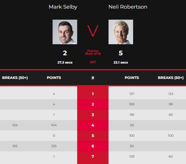 第一局,塞尔比长台不进,目标球漏了,罗伯逊上手单杆133分清台。第二局,塞尔比拼中袋不进,目标球吃到袋角留下机会,罗伯逊单杆99分拿下第二局。第三局,罗伯逊抓住机会长台上手,单杆83分拿下。罗伯逊3-0领先。