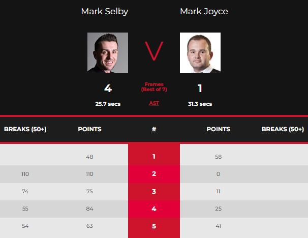 第2局比赛中,塞尔比迅速展开反攻,一杆精准的远台撕破防守后开始围球,打出单杆110分破百拿下这局,总分来到1-1平。第3局中乔伊斯连得11分后简单底袋失误,随后塞尔比围球一杆74分拿下这局反超总分,第4局塞尔比继续保持进攻势头,单杆55分拿下这局来到赛点,随后第5局一杆54分制胜,总分4-1胜出挺进第二轮。