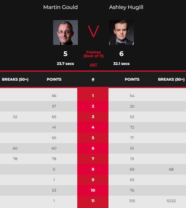 第8局,胡吉尔单杆68分扳成3-5。随后,胡吉尔又以63-1和75-53连胜两局,将比赛拖入决胜局。决胜局,胡吉尔单杆53分,只差一球便将超分。但他击打黑球却停在袋口。不过古尔德没能抓住最后的机会,胡吉尔拼进长台,最终6-5逆转取胜晋级。