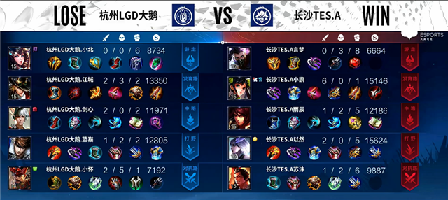 3分30秒镜拿下主宰。4分38秒公孙离推掉下路一塔。4分45秒野区团战,孙膑拿下一血,双方1换1。5分钟镜拿下暴君。7分40秒公孙离推掉上路一塔。8分40秒镜拿下主宰。9分40秒野区团战,长沙TES.A打出0换2。10分20秒橘右京拿下暴君,公孙离推掉中路一塔。11分10秒高地团战,长沙TES.A打出1换2,公孙离推掉下路高地塔。12分10秒橘右京拿下主宰。14分35秒河道团战,杭州LGD大鹅打出1换2。16分钟镜拿下主宰。16分10秒公孙离被击杀。16分40秒狄仁杰拿下暴君。20分钟风暴龙王团,双方1换1。21分54秒橘右京拿下风暴龙王。25分28秒公孙离抢下风暴龙王,团战杭州LGD大鹅打出1换4。26分13秒杭州LGD大鹅推掉水晶拿下本场比赛胜利。