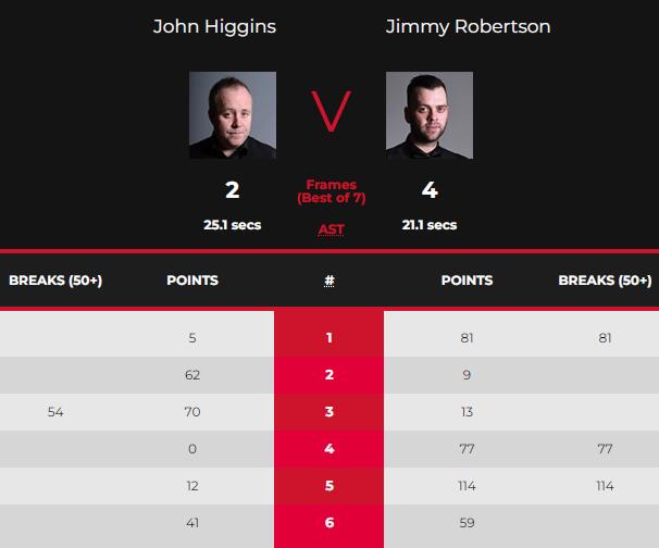 第一局,吉米-罗伯逊抓住机会单杆81分拿下第一局。二局,吉米-罗伯逊长台不进,希金斯单杆40分,母球贴到红球堆只能防守;防守比拼,吉米-罗伯逊留下机会,希金斯拿下17分;吉米-罗伯逊拿下9分,架杆绿球不进,希金斯再次上手拿下第二局。
