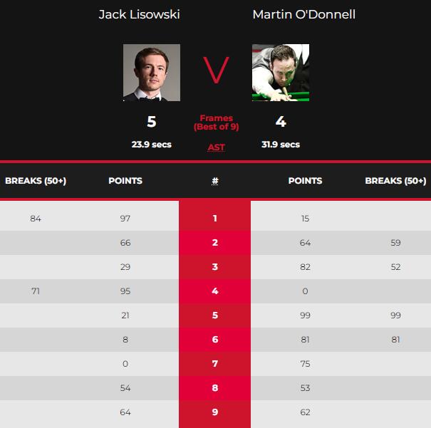 第一局,利索夫斯基单杆84分,以97-15拿下,第二局,奥唐奈打出单杆59分,但是利索夫斯基以66-64险胜,取得了2-0优势;第三局,奥唐奈单杆52分,以82-29追回一局;第四局,利索夫斯基单杆71分,以95-0拿下,利索夫斯基3-1领先进入中场休息。