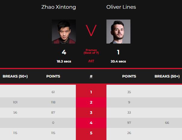 第五局,小莱恩斯开局率先上手得分,26-0后断掉。赵心童上手再也没有给小莱恩斯机会,他轰出单杆115分,115-26锁定胜局,总比分4-1获胜晋级。