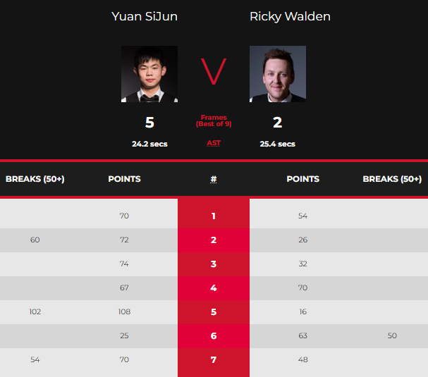 第五局,袁思俊爆发,单杆102分、108-16拿下,4-1拿到赛点。第六局,沃顿单杆50分扳回一局到2-4。第七局,双方都打得很谨慎,袁思俊65-24打丢黑球、并未能完成超分,但之后沃顿也失误,袁思俊还是顺利拿下,5-2轻松晋级。