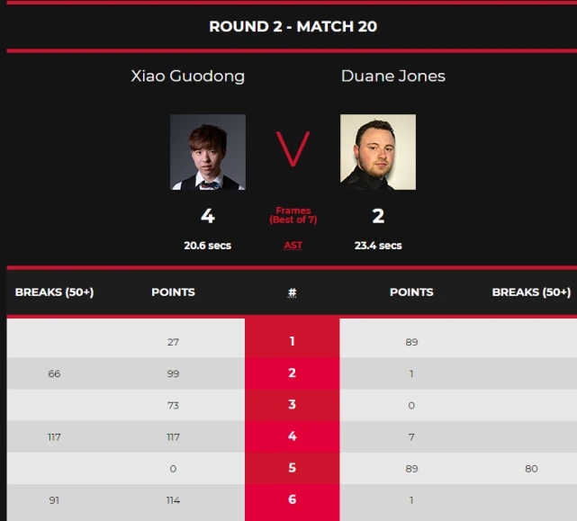 本场比赛第一局,杜恩琼斯开局率先发力,他通过几次上手,89-27先胜一局,1-0拔得头筹。第二局,肖国栋开始发力,他打出单杆66分,99-1扳回一局,比分追成1-1。第三局,肖国栋又通过几次上手,73-0再胜一局,2-1反超比分。