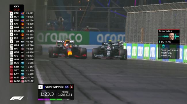 最终佩雷兹以1:28.021的成绩排名第一;里卡多在最后时刻上升至第三;博塔斯赛车故障回到维修区进行紧急维修;米克在计时圈中忘记使用DRS。Q1阶段被淘汰的五位车手是:拉提菲、维特尔、斯托尔、米克·舒马赫以及马泽平。