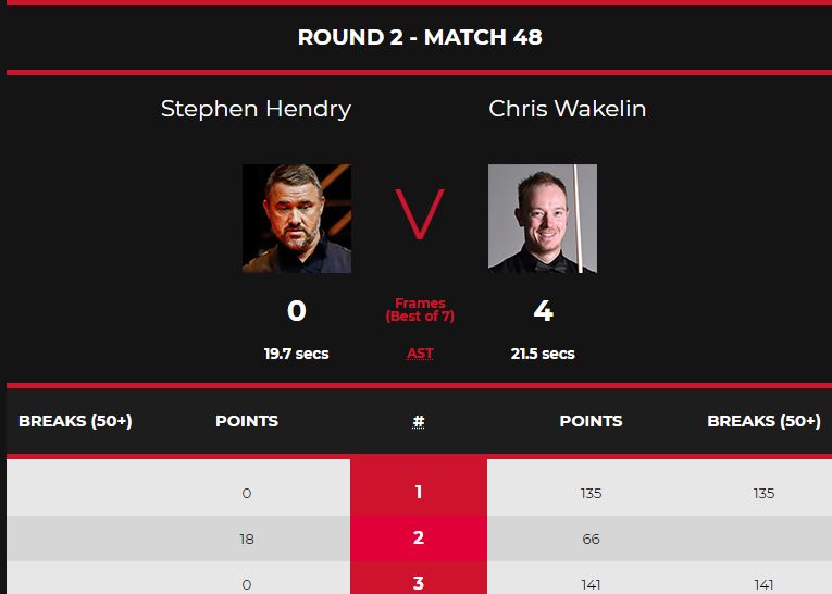 本场比赛第一局,韦克林一上来就展示出良好的进攻手感,他轰出单杆135分,135-0零封韦克林,1-0强势开局。第二局,韦克林通过几次上手,66-18再胜一局,2-0领先。第三局,韦克林的进攻状态更加火爆,他又轰出单杆141分,141-0再次零封亨德利,比分优势扩大到3-0,并不轻松赢得三给赛点。第四局,韦克林单杆轰85分以110:0拿下此局从而4-0横扫亨德利晋级。值得一提的是,亨德利在本场比赛中仅拿到18分,这也是继塞尔比以来第二位拿到单场低分的球员。