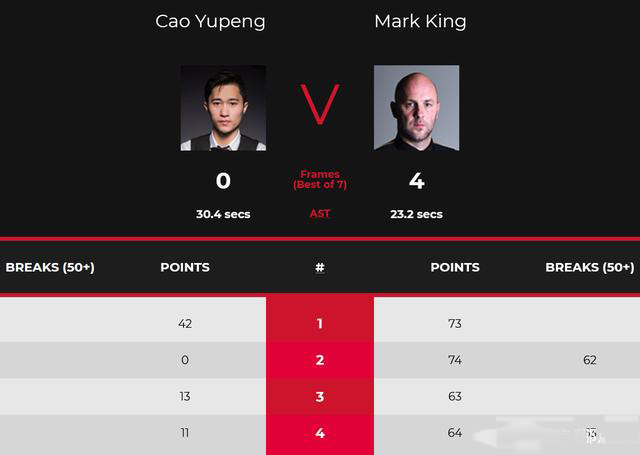 178直播讯11月2日晚上,2021斯诺克英格兰公开赛首轮,斯诺克英格兰公开赛第一轮(64进32),中国31岁老将曹宇鹏对阵马克金,最终,曹宇鹏0-4惨遭零封,状态比较低迷,遗憾一轮游,无缘32强!本场比赛,马克金打出了两杆60+,基本上全场都压制着曹宇鹏。