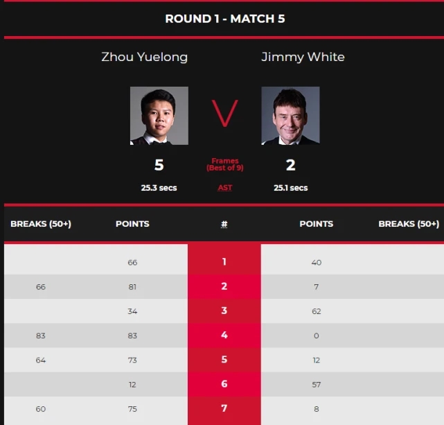 第二局比赛,周跃龙单杆81分制胜。第三局,吉米怀特扳回一城。第四局,周跃龙83-0零封对手。