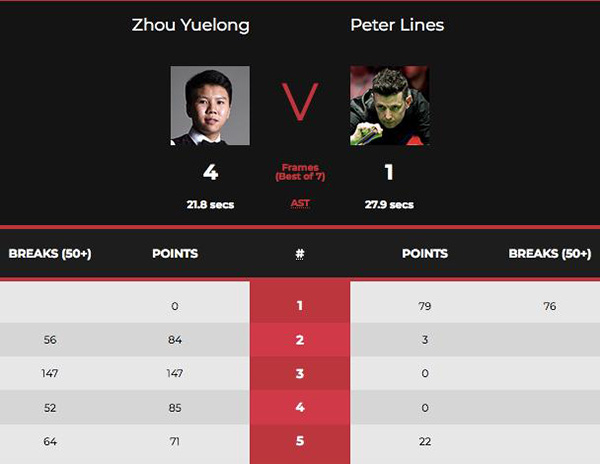 首局比赛中,英锦赛后仅有一天休息时间的周跃龙开局略显疲态,首局拼球失误送出机会,莱恩斯随后围球打出单杆76分的表现,总分1-0领先。第2局比赛开始周跃龙迅速调整状态,经过防守争夺后长台上手,随后进攻打出单杆56分拿下这局,总分来到1-1平。