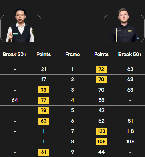 威尔逊反击:第七局,威尔逊单杆轰出118分,以123:1拿下,将比分追至3-4。第八局,威尔逊单杆108分,以108:1拿下,将比分追平为4-4。