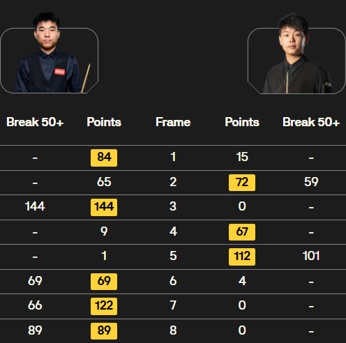 范争一逆转获胜:关键时刻,范争一展现出强大的心理素质和过硬的技术,在第六局轰出单杆 144 分的高分,这也是目前本届赛事的单杆最高分,凭借此局胜利,范争一将比分改写为 3-3 平。 之后,范争一又连续拿下第七局和第八局,最终以 5-3 的比分逆转战胜巩晨智,成功晋级正赛。