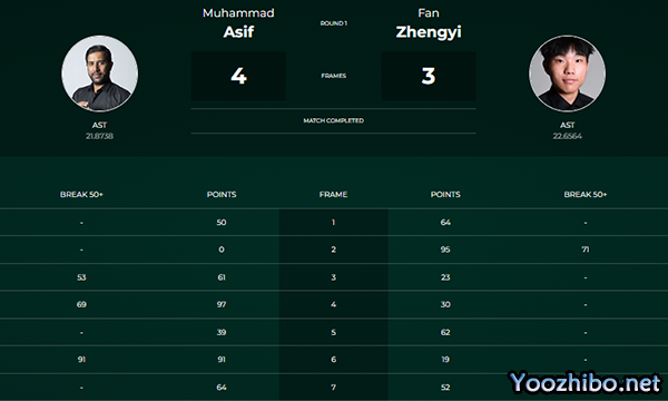 北京时间10月4日,2023斯诺克英格兰公开赛第2轮中,穆罕默德-阿斯夫对阵范争一,最终穆罕默德-阿斯夫打出单杆53分、69分、91分,大比分4-3险胜范争一,晋级下轮。