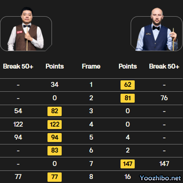 第八局,苏尔蒂先行捡漏上手,一杆二鸟两红相继而进,但好景不长,一杆拿下16分后,黑球底袋晃出,轻易交出球权,而丁主任再度上手,拒绝逆转,直接一杆77胜出,总分5:3,低开高走,有惊无险,成功晋级,可喜可贺,而苏尔蒂打出1杆147,玉山之战,输而无憾,虽败犹荣。