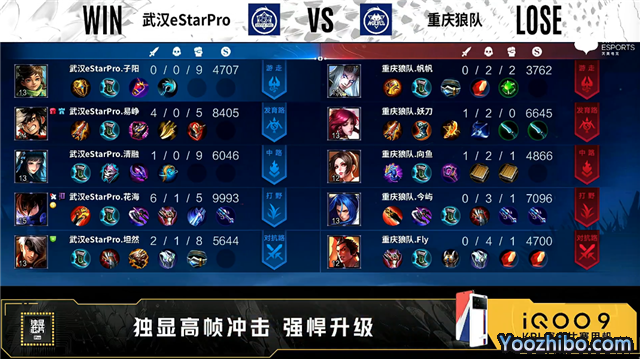 开局武汉eStar中路、发育路换线。3分02秒武汉eStar拿下暴君。3分41秒重庆狼队中路击杀牛魔拿到一血。4分08秒武汉eStar摧毁敌方对抗路外塔。4分23秒武汉eStar野区打出0换2。4分42秒重庆狼队摧毁敌方发育路外塔。4分46秒武汉eStar拿下主宰。6分25秒重庆狼队对抗路击杀上官婉儿。7分28秒武汉eStar拿下暴君。8分10秒重庆狼队发育路打出1换3,鲁班七号拿到三连决胜。10分15秒中路团战武汉eStar打出1换2。10分59秒武汉eStar拿下暗影暴君。11分36秒武汉eStar拿下暗影主宰。12分07秒中路团战武汉eStar打出0换3。12分34秒武汉eStar摧毁敌方水晶拿下比赛。