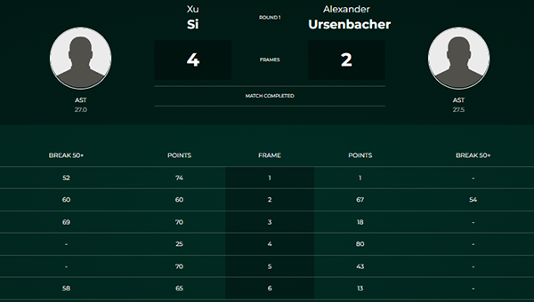 北京时间10月19日,2023斯诺克北爱尔兰资格赛中,徐思对阵乌森巴赫,最终,徐思凭借单杆打出52分、60分、69分、58分,总比分4-2击败对手乌森巴赫,成功晋级本届赛事的64强。