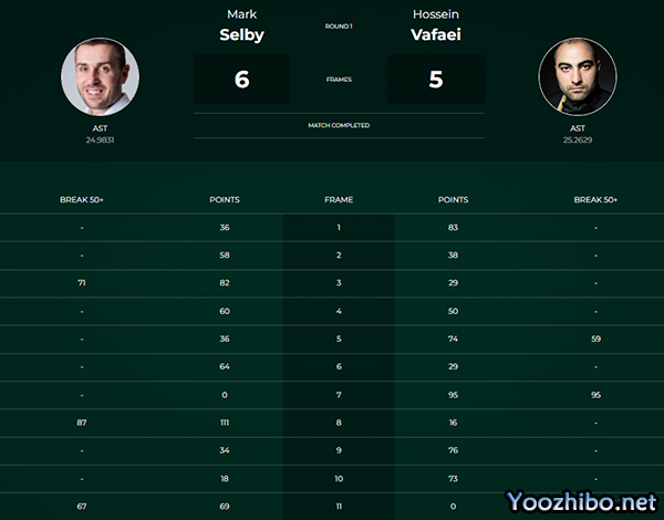 第四局,塞尔比凭借60:50的表现拿下此局比赛的胜利从而以3-1领先瓦菲继续扩大自己的领先优势。