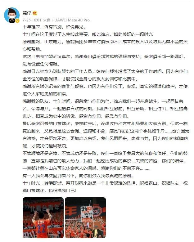 十年时光,转瞬即逝,离开对我来说是一个非常艰难的选择,祝福泰山,祝福队友,祝福山东球迷,也祝福我自己!