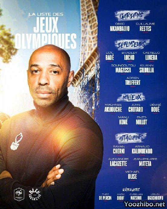 178直播讯 法国国奥公布了参加巴黎奥运会的最终18人名单,无姆巴佩,拉卡泽特和刚刚加盟拜仁的奥利斯入选,三名超龄球员是巴代、拉卡泽特、马特塔,球队的主帅是法国传奇前锋亨利。