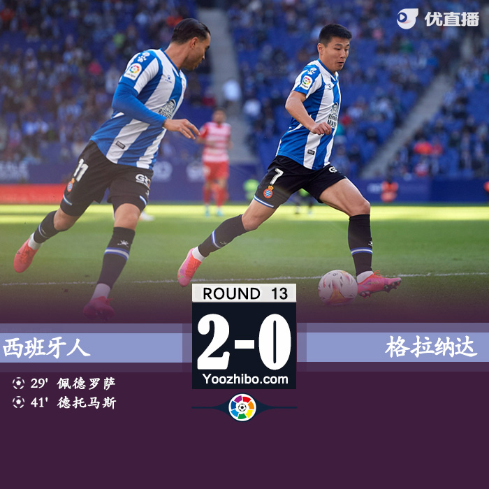 178直播11月6日讯 北京时间11月6日21:00,西甲联赛第13轮,西班牙人主场迎战格拉纳达。上半场比赛,佩德罗萨凌空抽射世界波破门,德托马斯头球建功。下半场比赛,埃雷拉进球被吹越位在先,武磊替补登场。最终全场比赛结束,西班牙人2-0战胜格拉纳达。